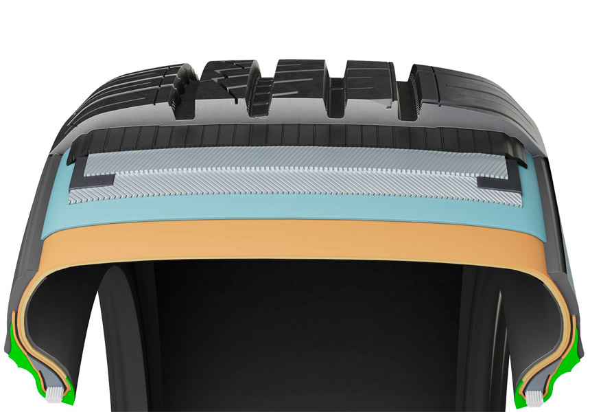 Блоки протектора внешней плевой секции прочно соединены между собой, таким образом стабилизируется управляемость и обеспечивается высокая точность управления в поворотах.