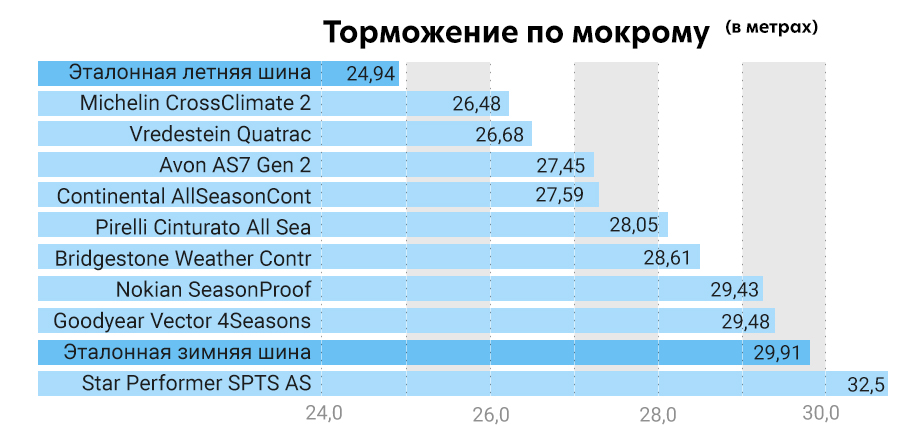 • Самый короткий тормозной путь на мокром покрытии при теплой температуре